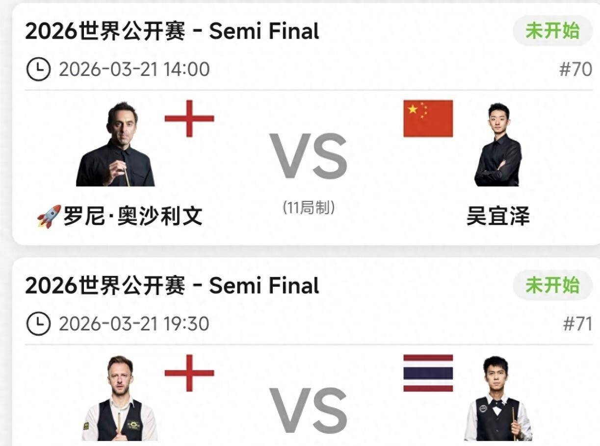 四强阵容构成了一个清晰的格局。 上半区是49岁的传奇对阵22岁的新星,下半区是世界第一对阵时隔四年重返半决赛的泰国选手。 奥沙利文刚刚创造了历史纪录,吴宜泽连续淘汰了两位顶尖高手。 特鲁姆普是夺冠热门,塔猜亚则扮演着黑马的角色。