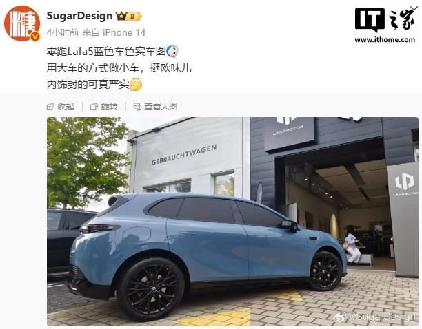 IT之家 9 月 13 日消息,零跑 Lafa5 蓝色实车图今日在社交平台曝光,该车在慕尼黑车展期间开启全球首秀并同步开启盲订,并于今年第四季度在中国大陆正式发布米牛金融,明年在全球市场陆续启动销售。