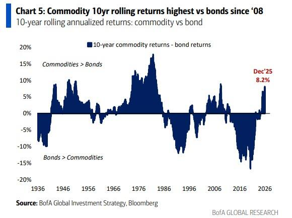 这一判断的核心逻辑在于经济政策范式转变:全球金融危机导致货币过度宽松但财政紧缩,令债券在长期停滞时代表现优于大宗商品;而新冠疫情后的财政过度宽松加上全球化终结,使得大宗商品在2020年代的民粹主义和通胀性增长时代表现优于债券。