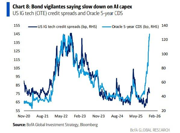 Hartnett认为,流动性峰值对应信用利差谷底,债券警惕者正在成为AI资本支出的新监管者,要求放缓增长,因为超大规模云服务商的资本支出占现金比例从2024年的50%(2400亿美元)跃升至2026年的80%(5400亿美元)。