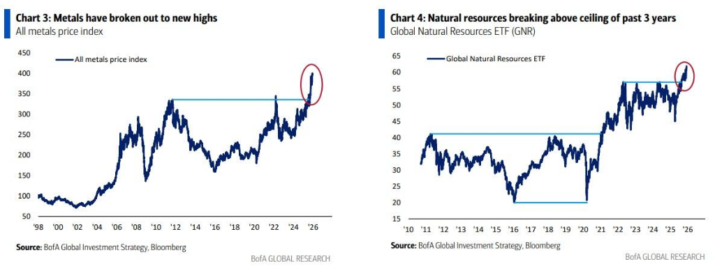 他强调,自然资源、金属以及拉美股市(今年迄今已上涨56%)正全面突破。在被市场长期冷落的商品领域,Hartnett特别看好石油和能源板块,认为这是2026年最佳的逆向投资机会。